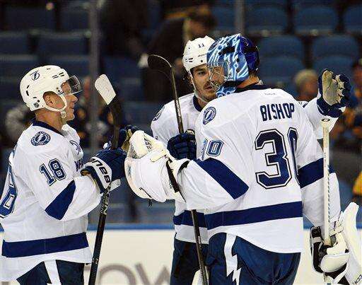 Tampa Bay Lightning Ondrej Palat (18) and Brian Boyle (11) celebrate with Ben Bishop (30) after an NHL hockey game against the Buffalo Sabres, Saturday, Oct.10, 2015 in Buffalo, N.Y. Tampa Bay won 4-1. (AP Photo/Gary Wiepert) The Associated Press