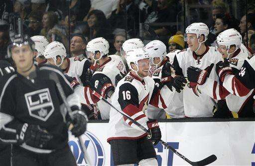 Arizona Coyotes' Max Domi, center, celebrates his goal with teammates during the second period of an NHL hockey game against the Los Angeles Kings, Friday, Oct. 9, 2015, in Los Angeles. (AP Photo/Jae C. Hong) The Associated Press