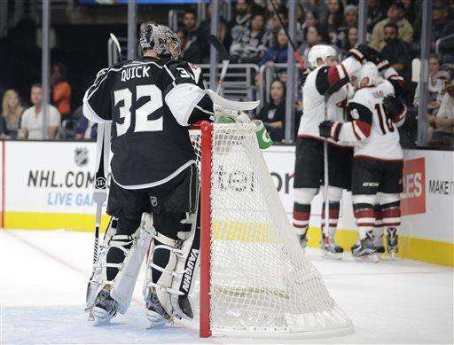 Los Angeles Kings goalie Jonathan Quick, left, grabs a drink as the Arizona Coyotes players celebrate a goal by Oliver Ekman-Larsson during the first period of an NHL hockey game, Friday, Oct. 9, 2015, in Los Angeles. (AP Photo/Jae C. Hong) The Associated Press