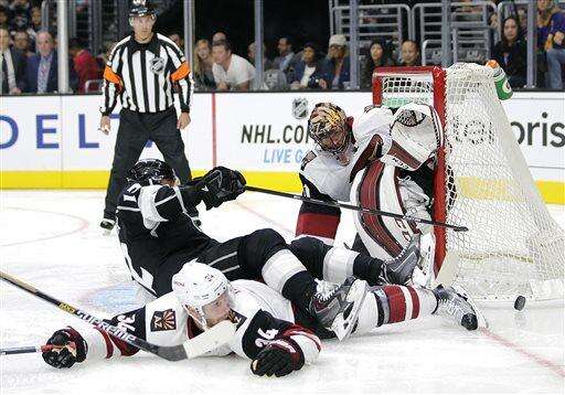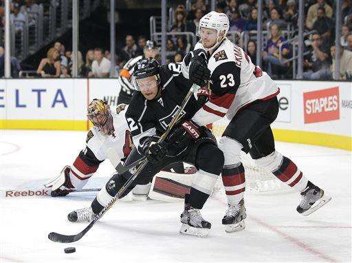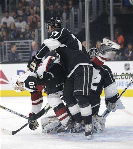 Arizona Coyotes' Antoine Vermette, left, is pushed by Los Angeles Kings' Milan Lucic, center, in front of Kings goalie Jonathan Quick during the first period of an NHL hockey game, Friday, Oct. 9, 2015, in Los Angeles. (AP Photo/Jae C. Hong) The Associated Press