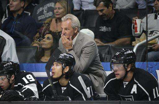 Los Angeles Kings head coach Darryl Sutter, center, watches from the bench during the second period of an NHL hockey game against the Arizona Coyotes, Friday, Oct. 9, 2015, in Los Angeles. (AP Photo/Jae C. Hong) The Associated Press