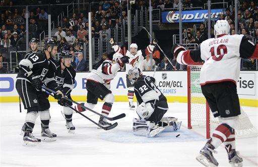 Arizona Coyotes' Oliver Ekman-Larsson, center left, of Sweden, celebrates his goal against Los Angeles Kings goalie Jonathan Quick, center right, during the first period of an NHL hockey game, Friday, Oct. 9, 2015, in Los Angeles. (AP Photo/Jae C. Hong) The Associated Press