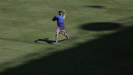 Texas Rangers' Cole Hamels throws during an American League Division Series baseball practice, Saturday, Oct. 10, 2015, in Arlington, Texas. The Rangers will face the Toronto Blue Jays in game 3 Sunday. (AP Photo/Eric Gay) The Associated Press