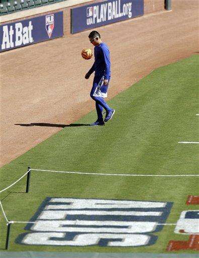 Toronto Blue Jays' Roberto Osuna plays with a soccer ball in the outfield at the beginning of an American League Division Series baseball practice, Saturday, Oct. 10, 2015, in Arlington, Texas. The Blue Jays will face the the Texas Rangers in game 3 Sunday. (AP Photo/Eric Gay) The Associated Press