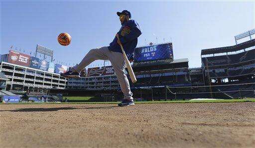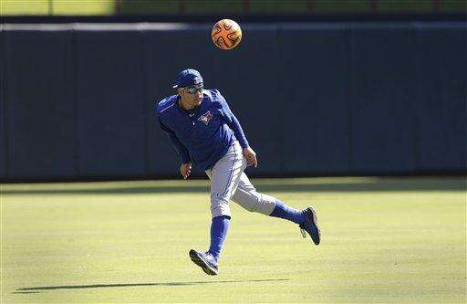 Toronto Blue Jays' Dioner Navarro kicks a soccer ball during an American League Division Series baseball practice, Saturday, Oct. 10, 2015, in Arlington, Texas. The Blue Jays will face the the Texas Rangers in game 3 Sunday. (AP Photo/Eric Gay) The Associated Press