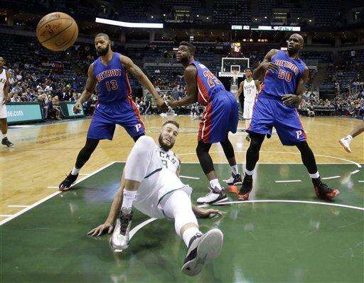 Milwaukee Bucks' Miles Plumlee lands on his back in front of Detroit Pistons' Marcus Morris (13), Reggie Bullock (25) and Joel Anthony (50) during the second half of an NBA preseason basketball game Saturday, Oct. 10, 2015, in Milwaukee. (AP Photo/Morry Gash) The Associated Press