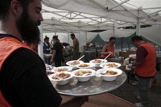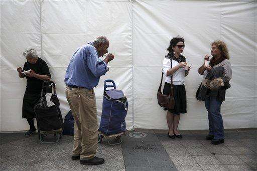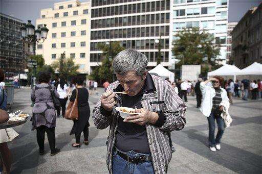 Despite the overcast sky, people lined up in a central square in the Greek capital on Sunday to eat briam, a casserole medley of vegetables, such as eggplant, zucchini, carrots and potatoes, as well as a dessert of fruit salad.