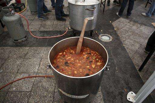 A cauldron with vegetable soup, made with 'wasted' produce deemed unsuitable by food stores because of their appearance, stands inside a tent during an event against food waste, in Athens, Greece, Sunday Oct. 11, 2015. The event was part of the 'Feeding5000' campaign which aims to highlight the waste of foodstuff in advanced societies. (AP Photo/Yorgos Karahalis)