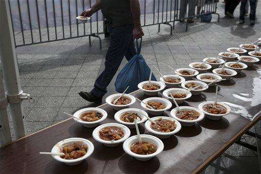 A man walks past served meals made with 'wasted' produce deemed unsuitable by food stores because of their appearance, during an event against food waste, in Athens, Greece, Sunday Oct. 11, 2015. The event was part of the 'Feeding5000' campaign which aims to highlight the waste of foodstuff in advanced societies. (AP Photo/Yorgos Karahalis)