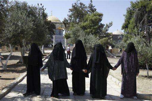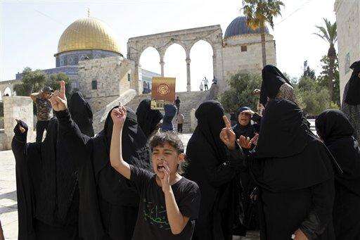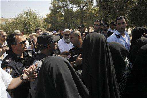 On a recent morning, about 200 activists, most women, sat in small circles under pine trees across the compound. At one point, the shouts of "God is Great" could be heard. Muslim activists, some cursing, were shouting at about 30 religious Jews, alleging some had attempted to pray. Police rushed the Jews off the mount.