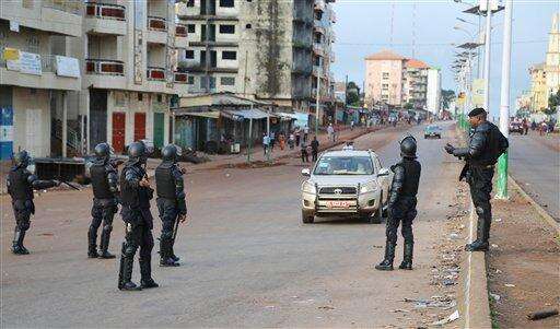 Guinea police officers man a checkpoint on a road during presidential elections in Conakry, Guinea, Sunday Oct. 11, 2015. Hundreds lined up in Guinea and began voting in the country’s second democratic presidential election in more than half a century. (AP Photo/Youssouf Bah) The Associated Press
