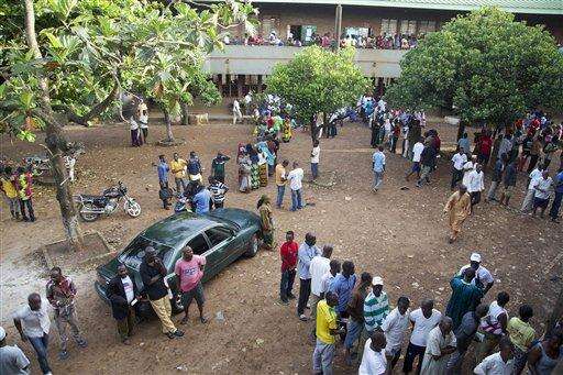 People queue to cast their votes during Presidential elections in the Bambeto neighbourhood of Conakry, Guinea, Sunday Oct. 11, 2015. Hundreds lined up in Guinea and began voting in the country’s second democratic presidential election in more than half a century. (AP Photo/Youssouf Bah) The Associated Press