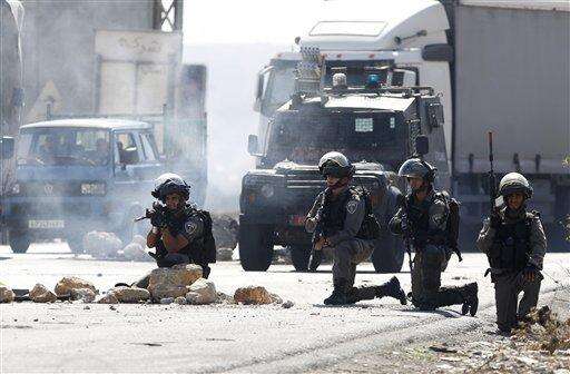 Israeli border policemen takes positions during clashes with Palestinians at the Hawara checkpoint near of the West Bank city of Nablus, Sunday, Oct. 11, 2015. Tensions in he West Bank continued with near-daily violent demonstrations. At least 45 Palestinians were wounded by live bullets in clashes between university students and Israeli forces at the military checkpoint near Nablus on Sunday, the Palestinian Health Ministry said. (AP Photo/Nasser Shiyoukhi) The Associated Press