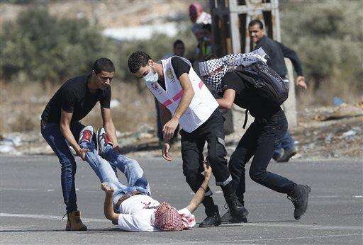 An injured Palestinian demonstrator is helped during clashes at the Hawara checkpoint near of the West Bank city of Nablus, Sunday, Oct. 11, 2015. Tensions in he West Bank continued with near-daily violent demonstrations. At least 45 Palestinians were wounded by live bullets in clashes between university students and Israeli forces at the military checkpoint near Nablus on Sunday, the Palestinian Health Ministry said. (AP Photo/Nasser Shiyoukhi) The Associated Press