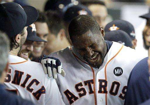 Houston Astros' Chris Carter is splashed with water in the dugout after hitting a home run against the Kansas City Royals during the seventh inning in Game 3 of baseball's American League Division Series Sunday, Oct. 11, 2015, in Houston. (AP Photo/Pat Sullivan) The Associated Press