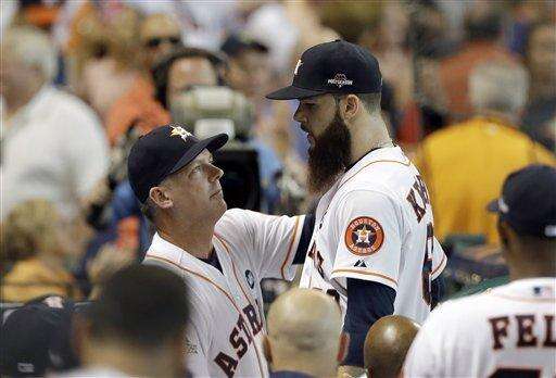 Houston Astros starting pitcher Dallas Keuchel, right, is greeted by manager A.J. Hinch after striking out Kansas City Royals' Lorenzo Cain during the seventh inning in Game 3 of baseball's American League Division Series Sunday, Oct. 11, 2015, in Houston. (AP Photo/Pat Sullivan) The Associated Press