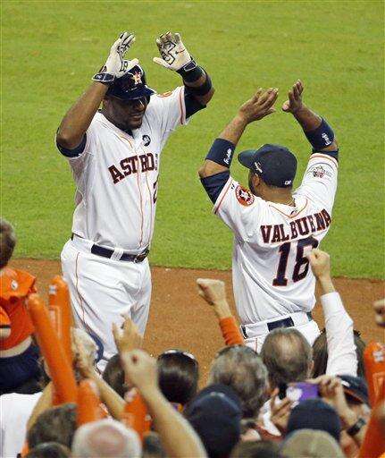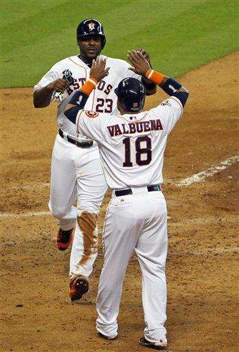 Houston Astros' Luis Valbuena (18) and Chris Carter (23) celebrate after scoring on a single by Jason Castro (15) during the fifth inning in Game 3 of baseball's American League Division Series against the Kansas City Royals Sunday, Oct. 11, 2015, in Houston. (AP Photo/Richard Carson) The Associated Press