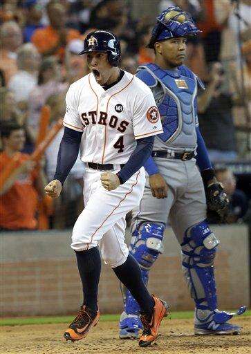 Houston Astros' George Springer (4) reacts after scoring on a single by Carlos Gomez as Kansas City Royals catcher Salvador Perez, right, watches during the sixth inning in Game 3 of baseball's American League Division Series Sunday, Oct. 11, 2015, in Houston. (AP Photo/Pat Sullivan) The Associated Press