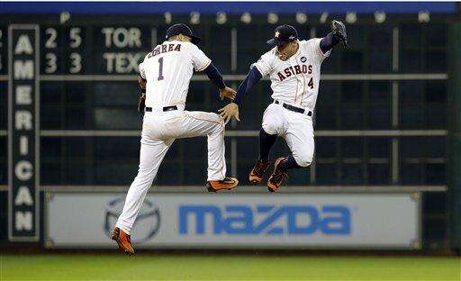 Houston Astros' Carlos Correa (1) and George Springer (4) celebrate after beating the Kansas City Royals 4-2 in Game 3 of baseball's American League Division Series Sunday, Oct. 11, 2015, in Houston. (AP Photo/Pat Sullivan) The Associated Press