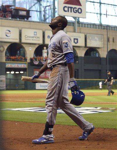 Kansas City Royals' Lorenzo Cain walks back to the dugout after striking out in the ninth inning to end the game against the Houston Astros in Game 3 of baseball's American League Division Series Sunday, Oct. 11, 2015, in Houston. The Astros won 4-2. (AP Photo/Patric Schneider) The Associated Press