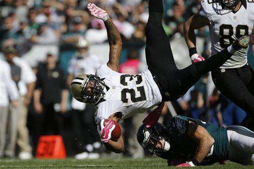 New Orleans Saints' Marcus Murphy is tackled by Philadelphia Eagles' Chris Maragos during the first half of an NFL football game, Sunday, Oct. 11, 2015, in Philadelphia. (AP Photo/Michael Perez) The Associated Press