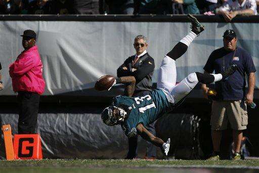 Philadelphia Eagles' Josh Huff flips into the end zone for a touchdown during the first half of an NFL football game against the New Orleans Saints, Sunday, Oct. 11, 2015, in Philadelphia. (AP Photo/Michael Perez) The Associated Press