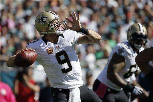 New Orleans Saints' Drew Brees passes during the first half of an NFL football game against the Philadelphia Eagles, Sunday, Oct. 11, 2015, in Philadelphia. (AP Photo/Michael Perez) The Associated Press