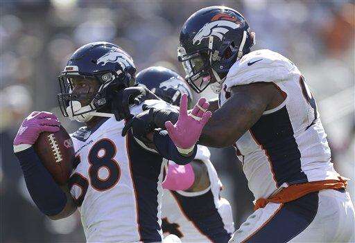 Denver Broncos linebacker Von Miller (58) celebrates with defensive end Malik Jackson after recovering a fumble by Oakland Raiders quarterback Derek Carr during the second half of an NFL football game in Oakland, Calif., Sunday, Oct. 11, 2015. (AP Photo/Ben Margot) The Associated Press