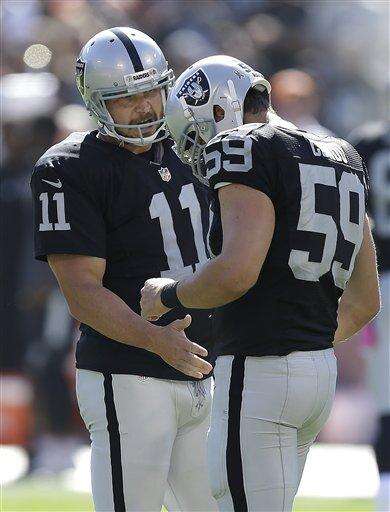 Oakland Raiders kicker Sebastian Janikowski (11) reacts with long snapper Jon Condo (59) after kicking a point after try during the first half of an NFL football game against the Denver Broncos in Oakland, Calif., Sunday, Oct. 11, 2015. Janikowski set the franchise record for games played with No. 241 against Denver. (AP Photo/Ben Margot) The Associated Press