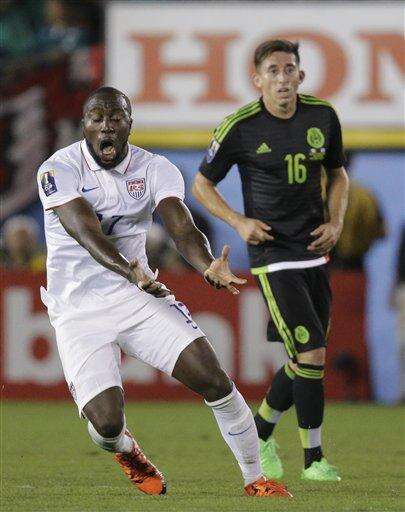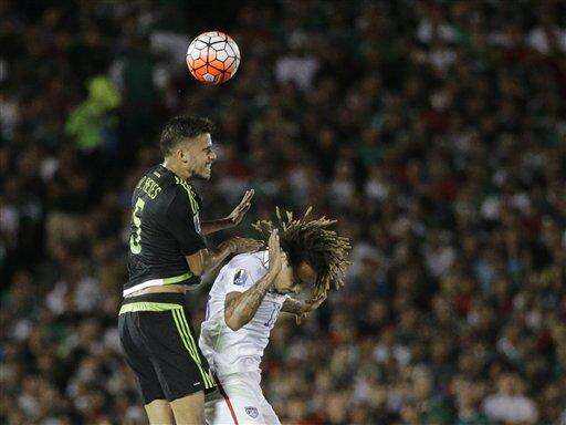 Mexicoâs Diego Reyes, left, and United Statesâ Jermaine Jones go for a header during the CONCACAF Confederations Cup playoff soccer match at the Rose Bowl Stadium, in Pasadena , Calif. Saturday, Oct. 10, 2015, (AP Photo/Jae C. Hong)