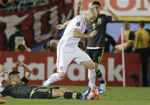 United Statesâ Geoff Cameron scores his team's first goal against Mexido during the CONCACAF Cup soccer match at the Rose Bowl Stadium, in Pasadena , Calif. Saturday, Oct. 10, 2015, (AP Photo/Jae C. Hong)