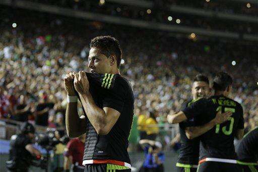 Mexicoâs Javier Hernandez, left, celebrates scoring his side's first goal against United States during the CONCACAF Cup soccer match at the Rose Bowl Stadium, in Pasadena , Calif. Saturday, Oct. 10, 2015. (AP Photo/Jae C. Hong)