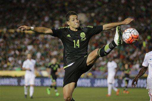 Mexicoâs Javier Hernandez plays the ball during the CONCACAF Cup soccer match against United States at the Rose Bowl Stadium, in Pasadena , Calif. Saturday, Oct. 10, 2015. (AP Photo/Jae C. Hong)