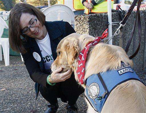 Oregon Gov. Kate Brown greets a therapy dog Monday, Oct. 12, 2015, during a tour of Umpqua Community College in Roseburg, Ore. Monday was the first day back to campus for students since the deadliest shooting in state history on Oct. 1. (Mike Henneke/The News-Review via AP, Pool) MANDATORY CREDIT The Associated Press