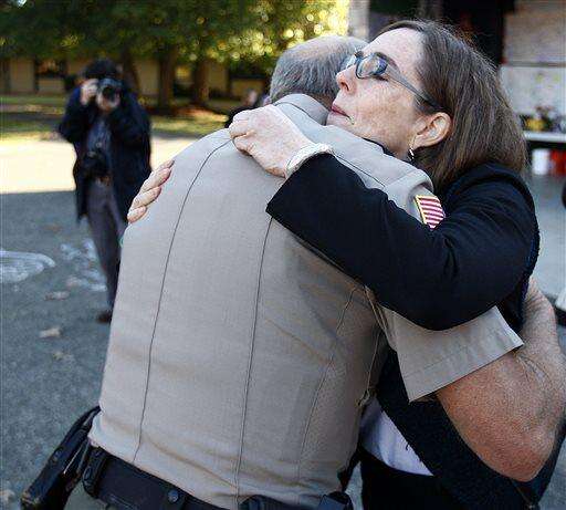Oregon Gov. Kate Brown, right, hugs Douglas County Sheriff's deputy Rick Held on Monday, Oct. 12, 2015, during a tour of Umpqua Community College in Roseburg, Ore. Monday was the first day back to campus for students since the deadliest shooting in state history on Oct. 1. (Mike Henneke/The News-Review via AP, Pool) MANDATORY CREDIT The Associated Press