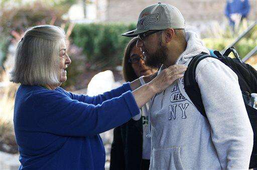 With Oregon Gov. Kate Brown looking on, Umpqua Community College interim President Rita Cavin, left, greets an unidentified student on campus Monday, Oct. 12, 2015, in Roseburg, Ore. Monday was the first day back to campus for students since the deadliest shooting in state history on Oct. 1. (Mike Henneke/The News-Review via AP, Pool) MANDATORY CREDIT The Associated Press