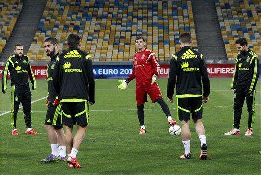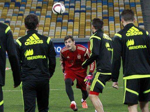 Spain national soccer team goalkeeper Iker Casillas, center, during a training session a day ahead their Group C, Euro 2016 qualifying soccer match against Ukraine at the Olympiyskiy national stadium in Kiev, Ukraine, Sunday, Oct. 11, 2015. (AP Photo/Sergei Chuzavkov) The Associated Press