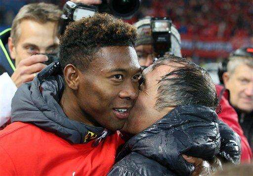 David Alaba and coach Marcel Koller, right, celebrate the first place at the Euro 2016 soccer qualifying group G after the match between Austria and Liechtenstein in Vienna, Austria, Monday, Oct. 12, 2015. (AP Photo/Ronald Zak) The Associated Press