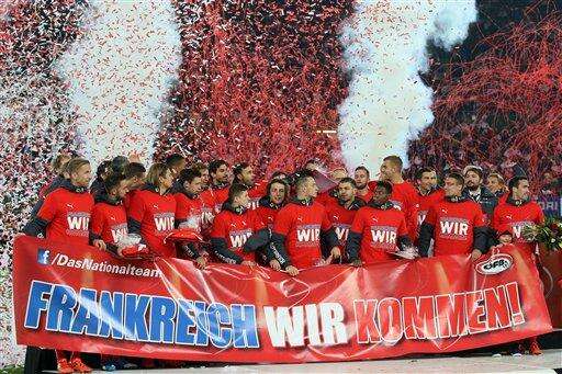 Austria's team celebrates the first place at the Euro 2016 soccer qualifying group G after the match between Austria and Liechtenstein in Vienna, Austria, Monday, Oct. 12, 2015. Writing reads: "France we come". (AP Photo/Ronald Zak) The Associated Press