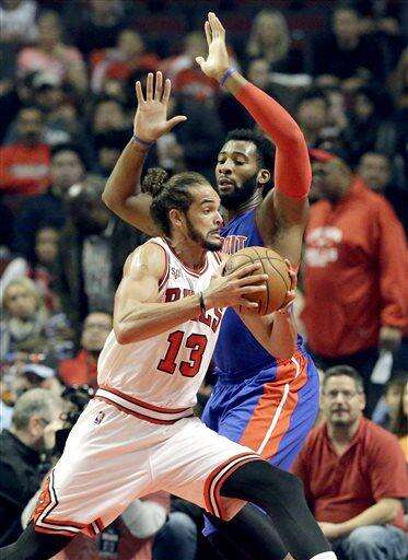 Chicago Bulls center/forward Joakim Noah (13) drives against Detroit Pistons center Andre Drummond during the first half of an NBA preseason basketball game on Wednesday, Oct. 14, 2015, in Chicago. (AP Photo/Nam Y. Huh)