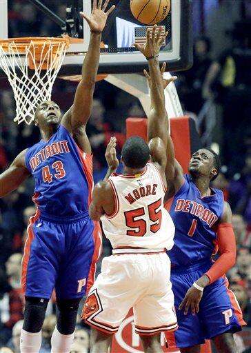 Detroit Pistons forward Anthony Tolliver (43) and guard Reggie Jackson (1) block a shot by Chicago Bulls guard E'Twaun Moore during the first half of an NBA preseason basketball game on Wednesday, Oct. 14, 2015, in Chicago. (AP Photo/Nam Y. Huh)