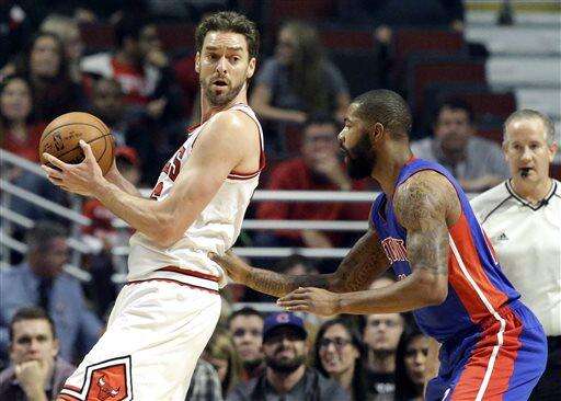 Chicago Bulls forward/center Pau Gasol, left, looks to a pass as Detroit Pistons forward Marcus Morris guards during the first half of an NBA preseason basketball game on Wednesday, Oct. 14, 2015, in Chicago. (AP Photo/Nam Y. Huh)