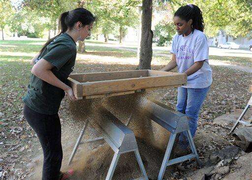 University of Evansville students Soyla Garcia, left, and Titianna Folson use a sifter as they sort through buckets of dirt Wednesday, Oct. 14, 2015, in Evansville, Ind., in an area that used to be used as student housing for veterans and their families, known as Tin City, on the campus from 1947 to 1961. The students in Alan Kaiser’s Field Methods in Archaeology class continued to search and learn more about the residents from hat time. (Jason Clark/Evansville Courier & Press via AP) The Associated Press