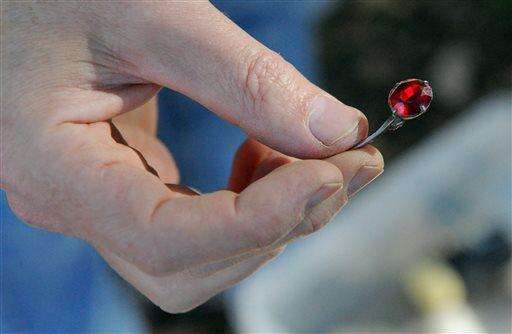 University of Evansville archaeology professor Alan Kaiser shows a portion of a pendant that was found during an excavation of a portion of the area of former student housing for veterans and their families known as Tin City on the campus from 1947 to 1961, on Wednesday, Oct. 14, 2015, in Evansville, Ind. (Jason Clark/Evansville Courier & Press via AP) The Associated Press