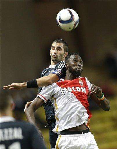 Monaco's Lacina Traore, right, challenges for the ball with Lyon's Maxime Gonalons during their French League One soccer match, in Monaco stadium, Friday, Oct. 16, 2015. (AP Photo/Lionel Cironneau) The Associated Press