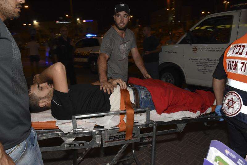 A wounded Israeli policeman is evacuated Sunday from the scene of an attacked in Beersheba, Israel. Associated Press