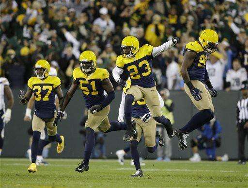 Green Bay Packers' Damarious Randall (23) celebrates after breaking up a pass intended for San Diego Chargers' Danny Woodhead on the final play of an NFL football game Sunday, Oct. 18, 2015, in Green Bay, Wis. The Packers won the game 27-20. (AP Photo/Jeffrey Phelps) The Associated Press