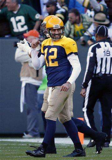 Green Bay Packers quarterback Aaron Rodgers (12) reacts after James Starks ran 65-yards for a touchdown during the first half of an NFL football game against the San Diego Chargers, Sunday, Oct. 18, 2015, in Green Bay, Wis. (AP Photo/Mike Roemer) The Associated Press