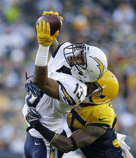 San Diego Chargers' Keenan Allen (13) makes a reception against Green Bay Packers' Sam Shields during the first half of an NFL football game, Sunday, Oct. 18, 2015, in Green Bay, Wis. (AP Photo/Jeffrey Phelps) The Associated Press