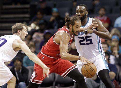 Chicago Bulls' Joakim Noah, center, drives between Charlotte Hornets' Al Jefferson, right, and Cody Zeller in the first half of an NBA preseason basketball game in Charlotte, N.C., Monday, Oct. 19, 2015. (AP Photo/Chuck Burton)